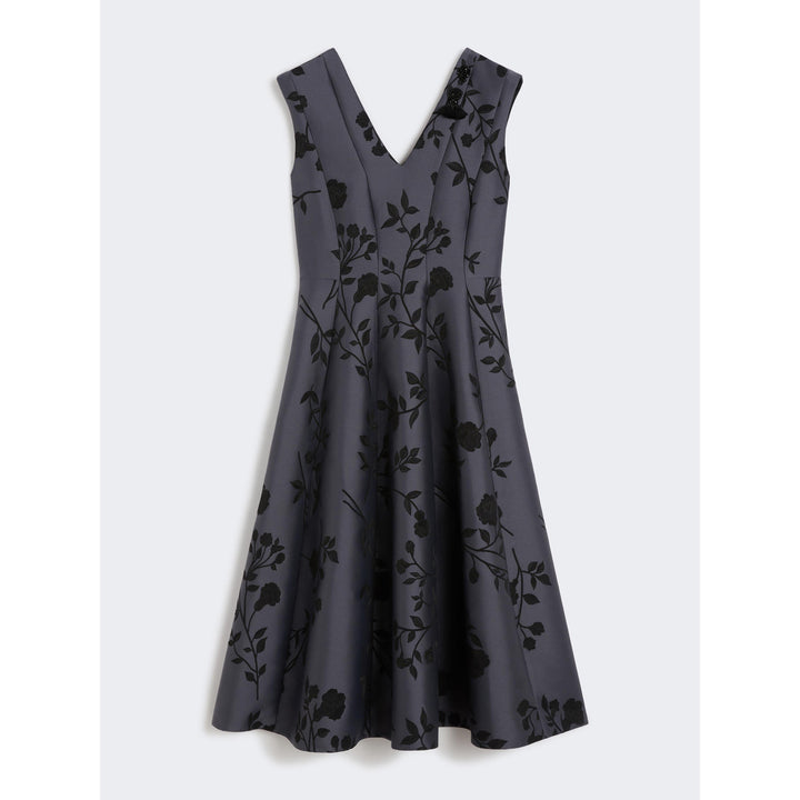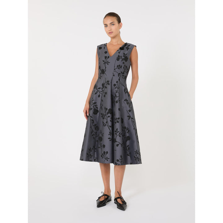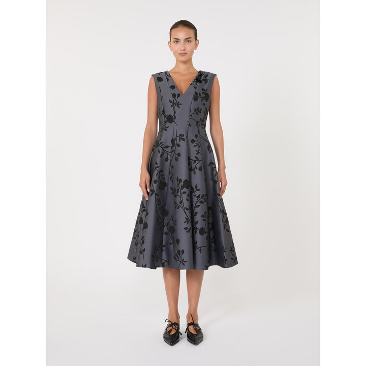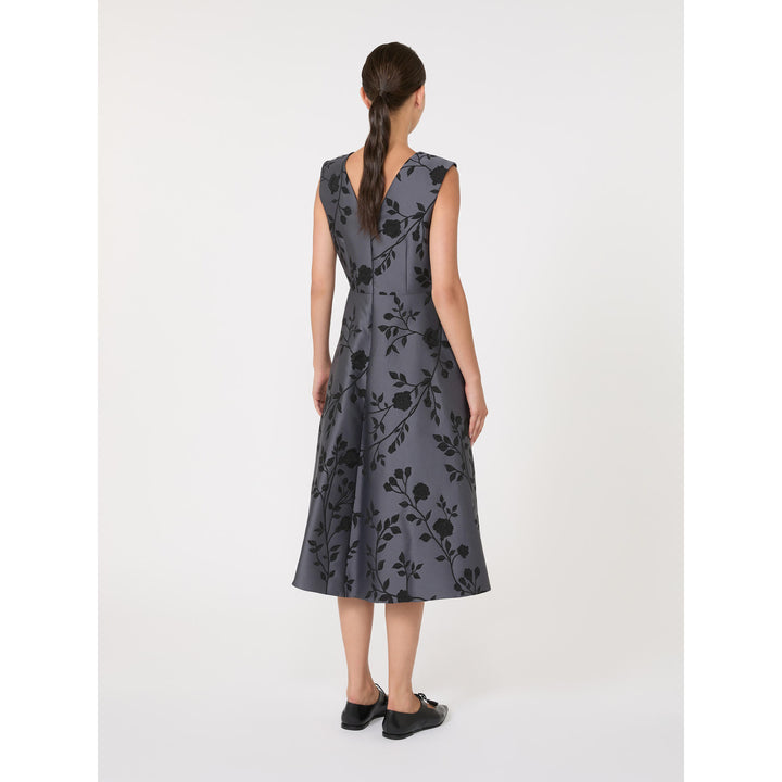 Abito midi smanicato caratterizzato da bustino sagomato e gonna svasata. In misto cotone con disegno jacquard. Vestibilità fit and flare. Scollo a V davanti e sul retro, con applicazioni gioiello rimovibili. Chiusura con zip invisibile sul retro Tasche inserite nei fianchi