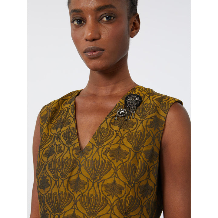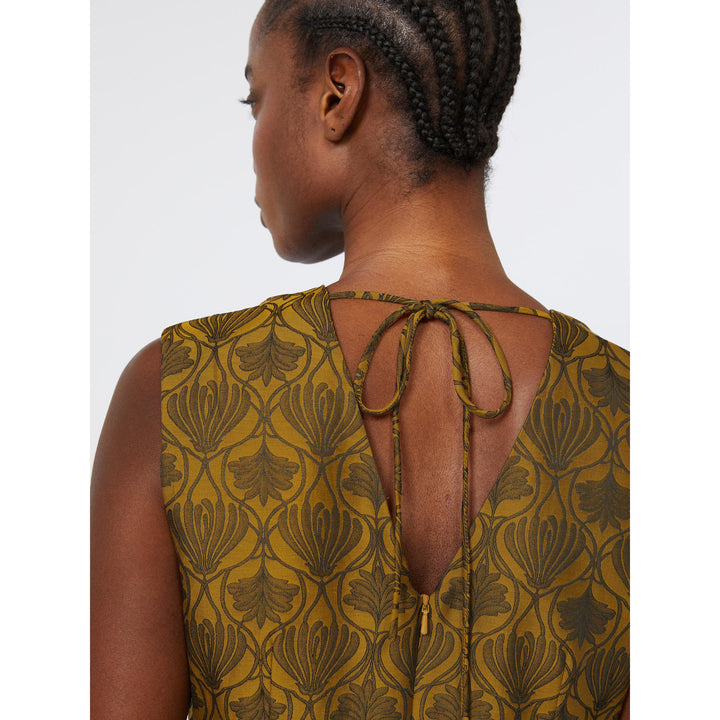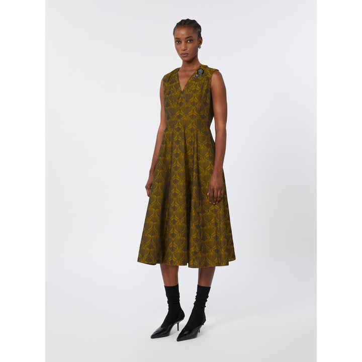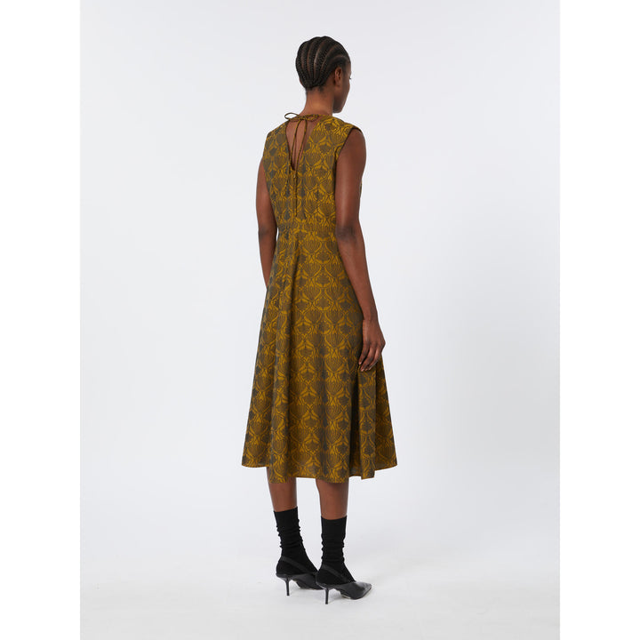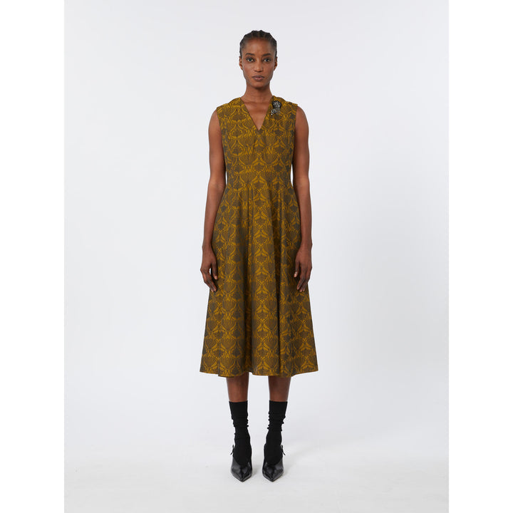 Abito midi caratterizzato da bustino sagomato e gonna svasata. Abito in misto cotone con disegno jacquard. Vestibilità fit and flare. Scollo a V davanti e sul retro, con applicazioni gioiello rimovibili. Smanicato. Chiusura con lacci da annodare sul retro del collo e zip invisibile. Tasche inserite nei fianchi. Semifoderato