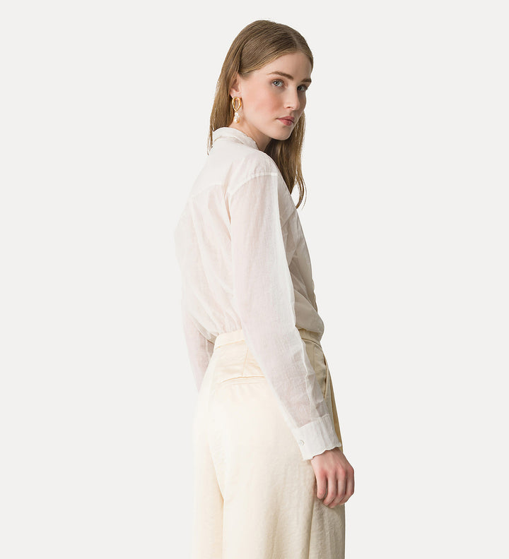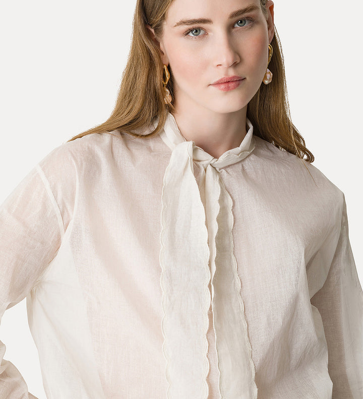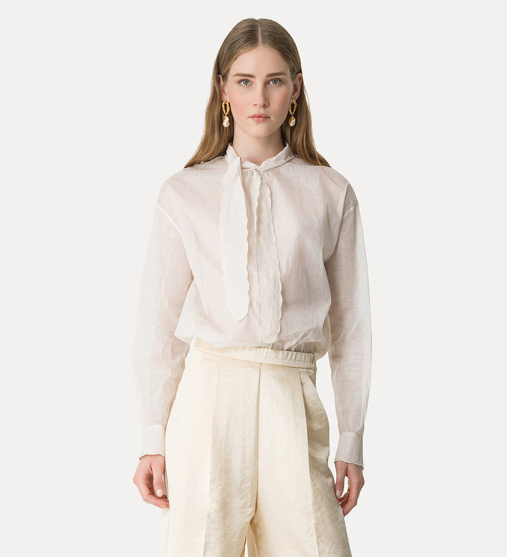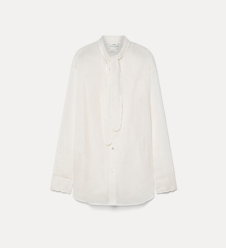 Camicia in mussola con fiocco “mémoires d'enfance”. Il collo alla coreana si arricchisce di smerlature impunturate e si chiude con una sottile fascia da annodare in un fiocco. i bottoni in madreperla completano l’equilibrio tra essenzialità e delicatezza.