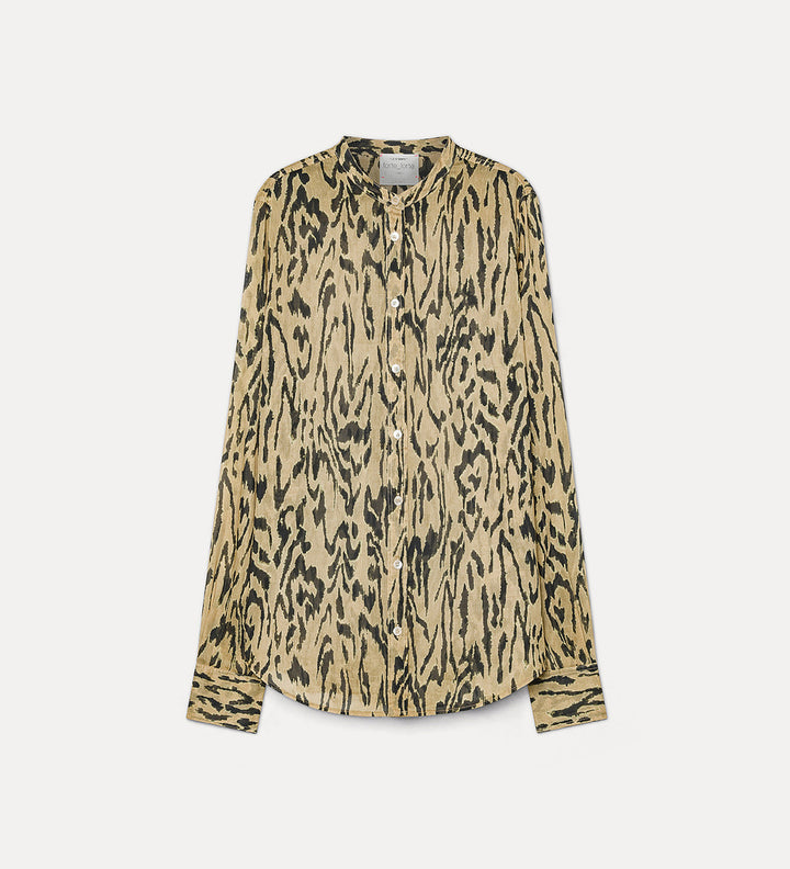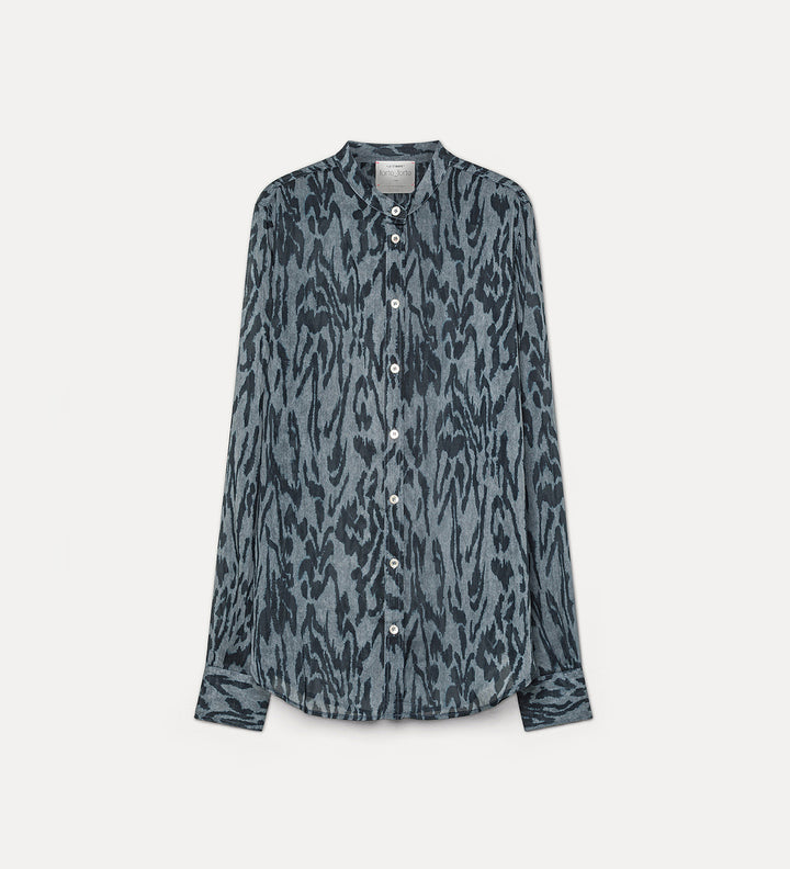 delicata e leggerissima, la camicia con collo serafino in voile con stampa “moiré” introduce una nuova interpretazione dell'animalier, con grazia tutta femminile. facile da abbinare ai denim, è il nuovo essential che sorprende e rinnova il tuo guardaroba.