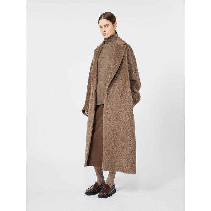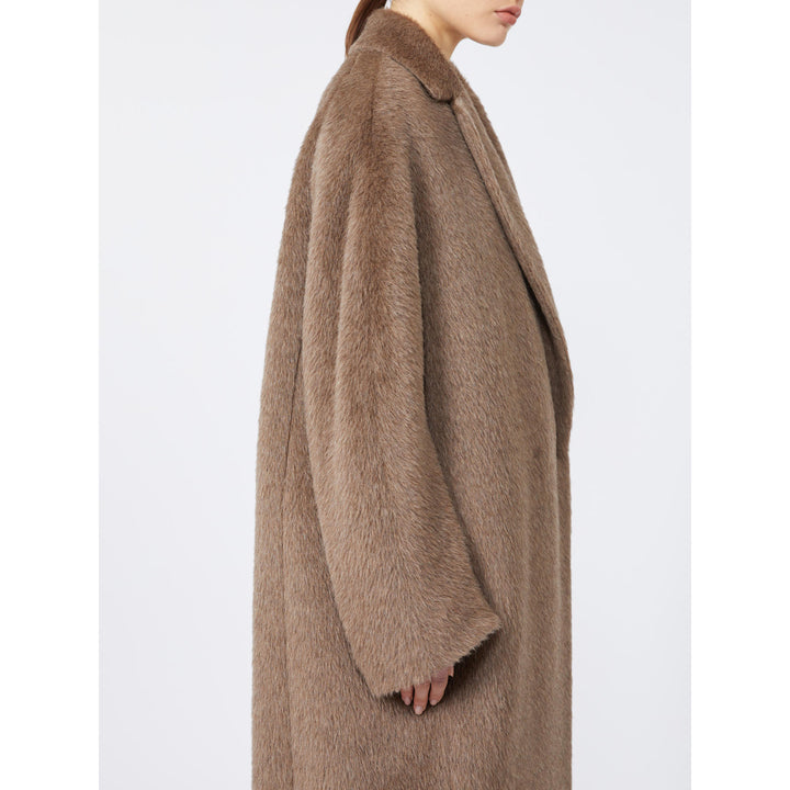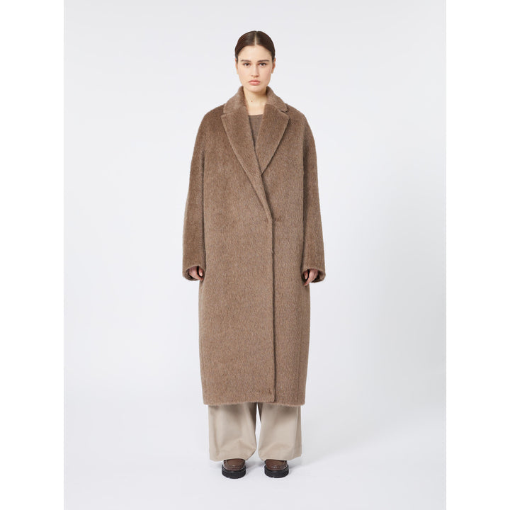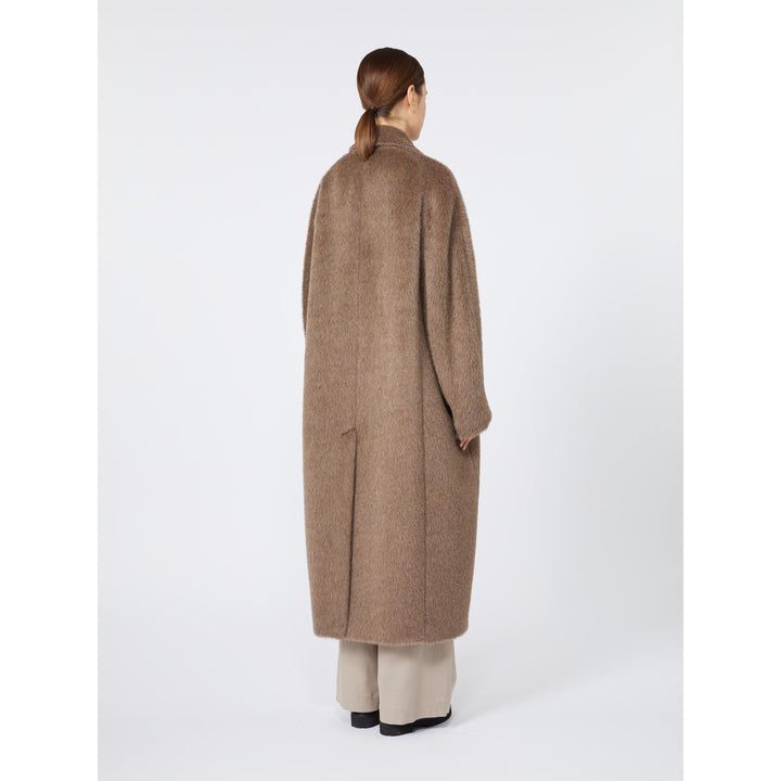 Cappotto lungo in lana, alpaca e cachemire a pelo lungo. Linea over con spacco centrale sul retro. Maniche a kimono sul davanti e raglan sul retro
