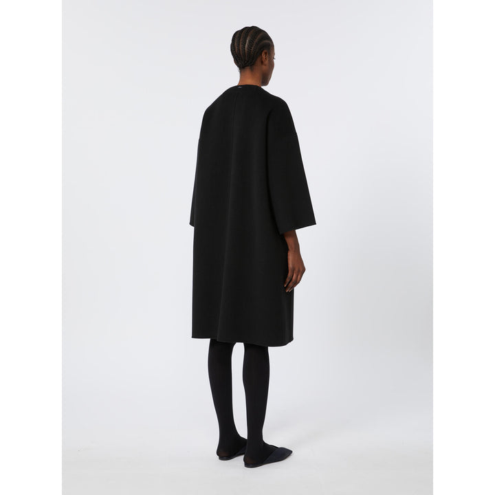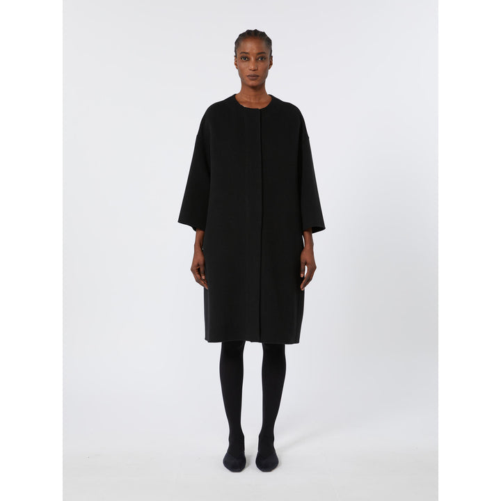 Cappotto lungo caratterizzato da una silhouette dritta con spalla scesa. Cappotto in doppio drap di pura lana cucito a mano. Girocollo. Maniche lunghe a giro basso. Chiusura frontale con bottoni nascosti. Tasche inserite nei fianchi. Sfoderato