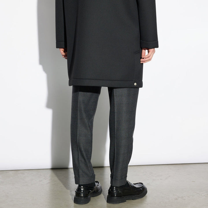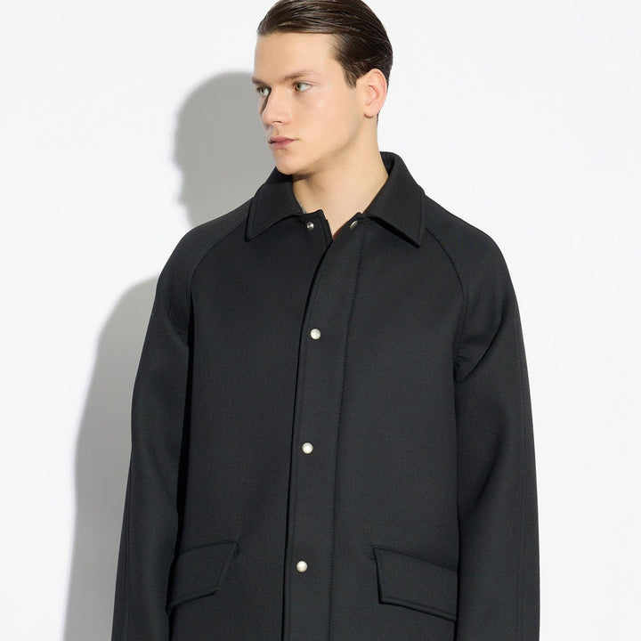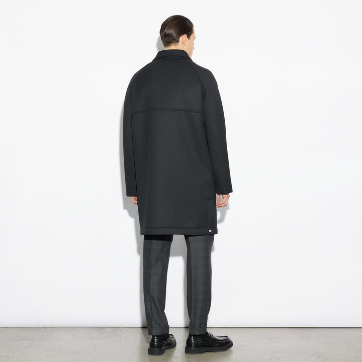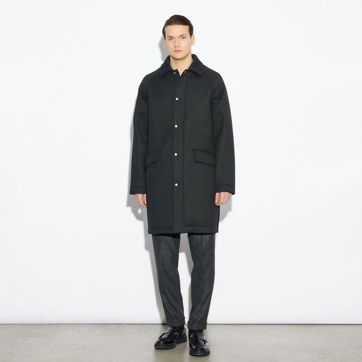 Cappotto spolverino in tecno lana con colletto a camicia e tasche a pattina. Il design minimalista con chiusura a bottoni a pressione e linea pulita esprime uno stile essenziale e contemporaneo. Realizzato in tessuto tecnico compatto e fluido