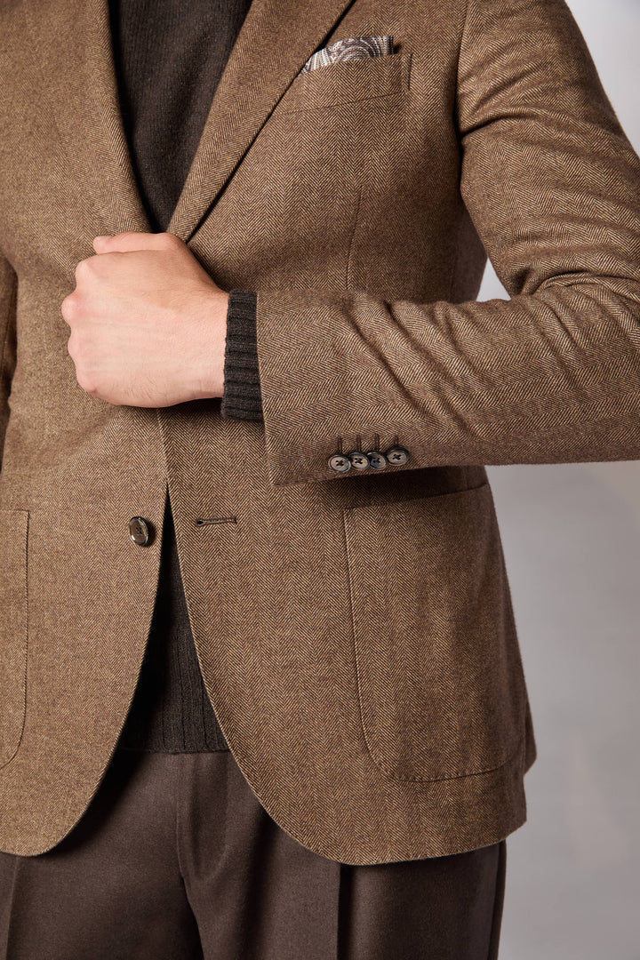 Realizzata in puro cotone non trattato, questa giacca monopetto da uomo si distingue per i caldi toni del marrone e il taglio pulito dal gusto contemporaneo. La raffinata fantasia spigata tono su tono dona profondità e movimento alla texture, valorizzando il capo con un'eleganza discreta. Perfetta per chi cerca uno stile essenziale ma ricercato, ideale in contesti casual chic o semi-formali.