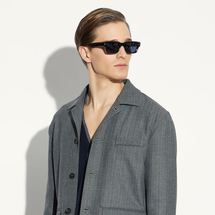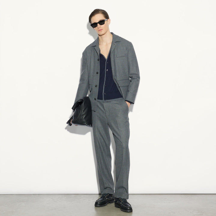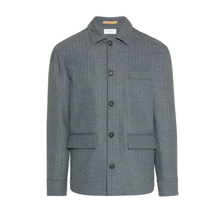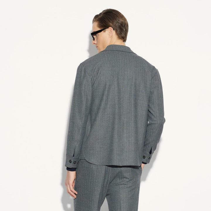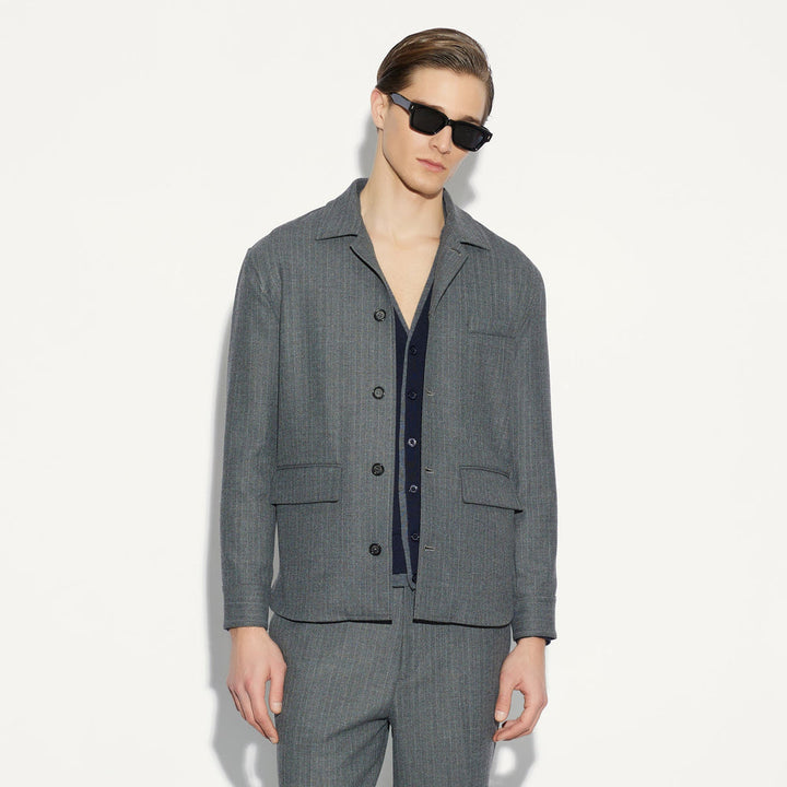Giacca camicia sfoderata in fresco lana rigata tono su tono con fondo grigio. Il design con colletto classico, chiusura a bottoni e tasche a pattina unisce praticità ed eleganza discreta. Un capo morbido e strutturato, ideale per look formali o smart casual