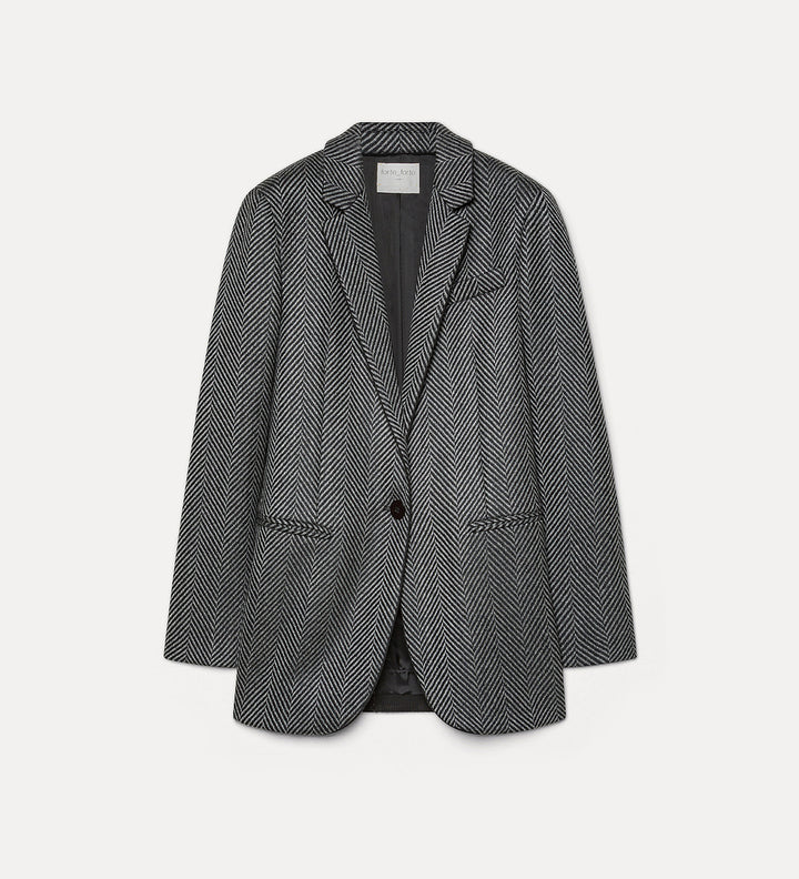 Giacca chic chevron in lana ricorda i capi iconici dei guardaroba del passato, ricodificati con una nuova, fresca percezione. le linee sono allungate nel busto, con spacco posteriore e taschino al petto. il bordo nero in passamaneria lungo lo scollo aggiunge una nota grafica.
