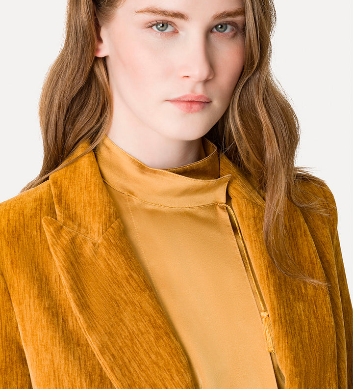 Giacca doppiopetto di media lunghezza in velluto doppio con spalle regolari e vestibilità morbida