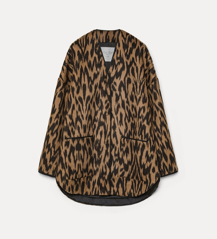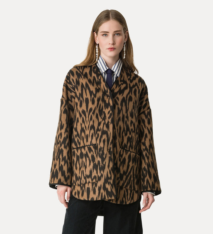 Giaccone in panno con effetto “moiré” rimane in equilibrio tra il carattere deciso della fantasia e i volumi décontracté. i bordi in passamaneria a contrasto, il fondo asimmetrico con spacchetti stondati e la tasca applicata addolciscono l'importanza del panno in lana e cotone, con legatura in seta.