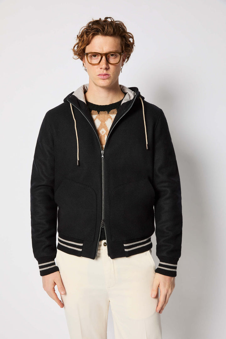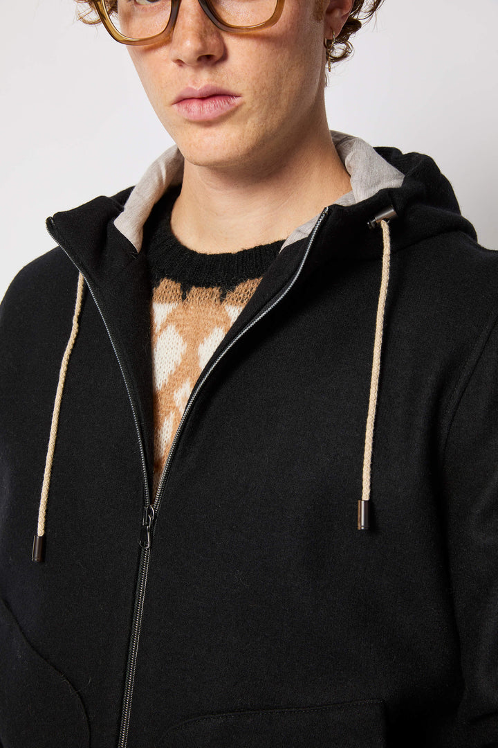 Felpa da uomo con zip frontale bidirezionale e cappuccio con coulisse nera con dettagli in contrasto beige su polsini, interno cappuccio e fondo. Dal carattere sportivo e casual questo capo è dotato di 2 comode tasche ed è perfetto per essere utilizzato nelle giornate più informali sia in sostituzione al cappotto, sia a vista come maglione.