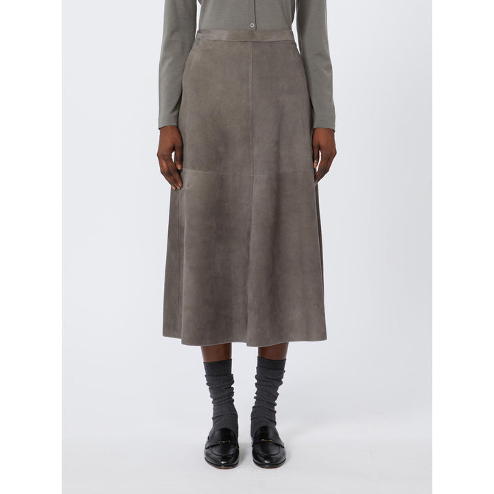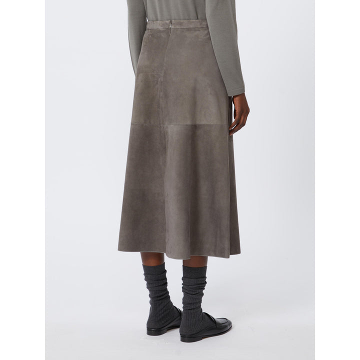 Gonna midi, rifinita con tagli e impunture stile pelletteria. Gonna in suede. Linea svasata. Vita regolare. Chiusura con zip nascosta sul retro.