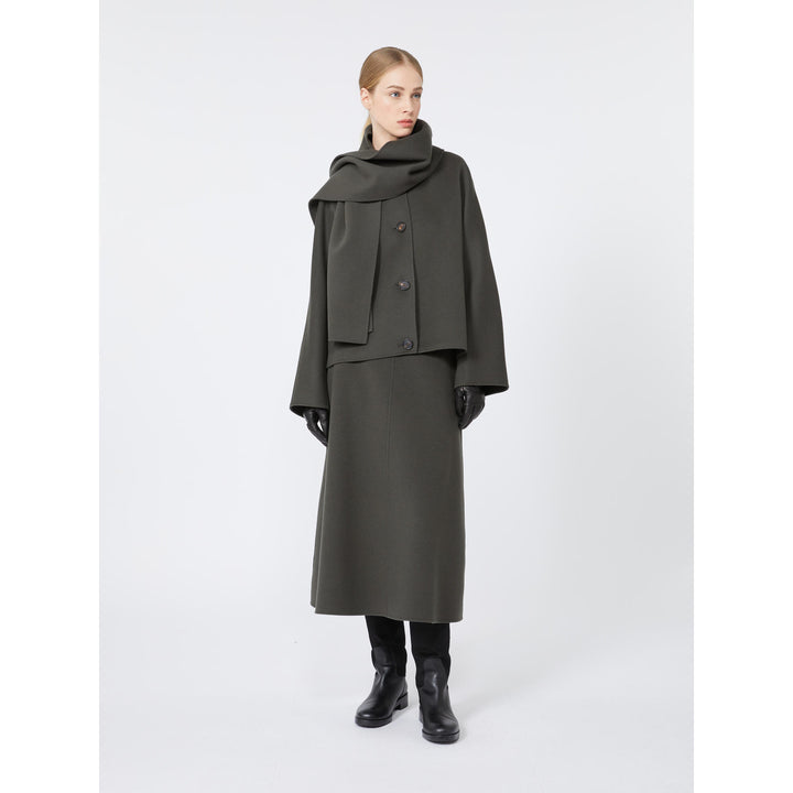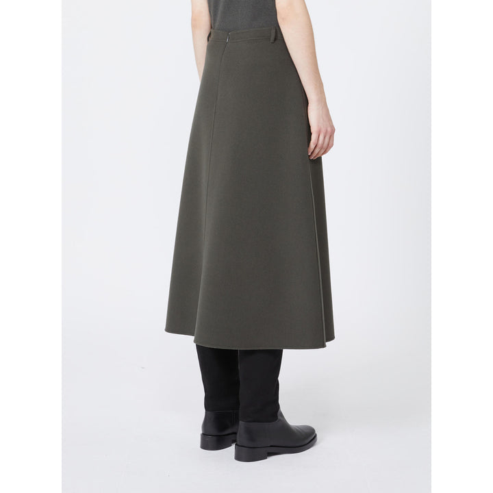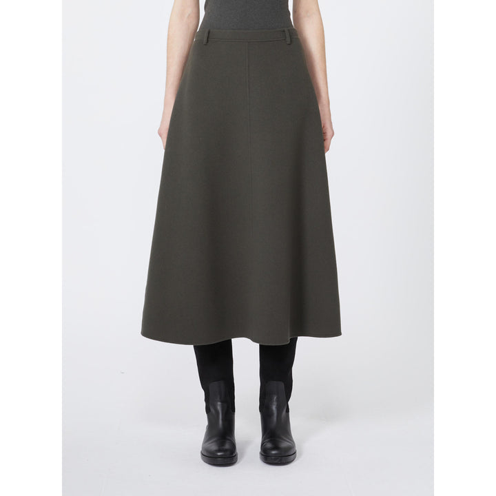 Gonna lunga dalla linea leggermente svasata in drap di pura lana double, cucito a mano foderata in pura seta. Vita regolare Chiusura con zip nascosta sul retro