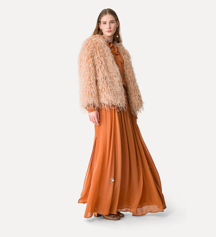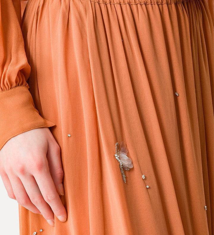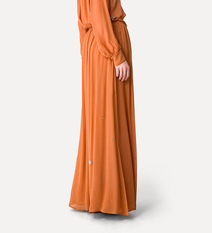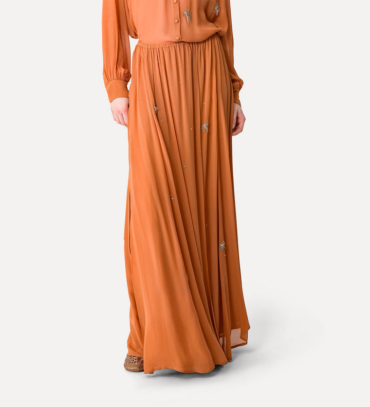 Gonna lunga con ricamo “carrousel des sylphes”, luminose libellule in perline e micro cristalli ricamati a mano si posano su tutta la lunghezza, come giardino incantando illuminato dai raggi del sole.