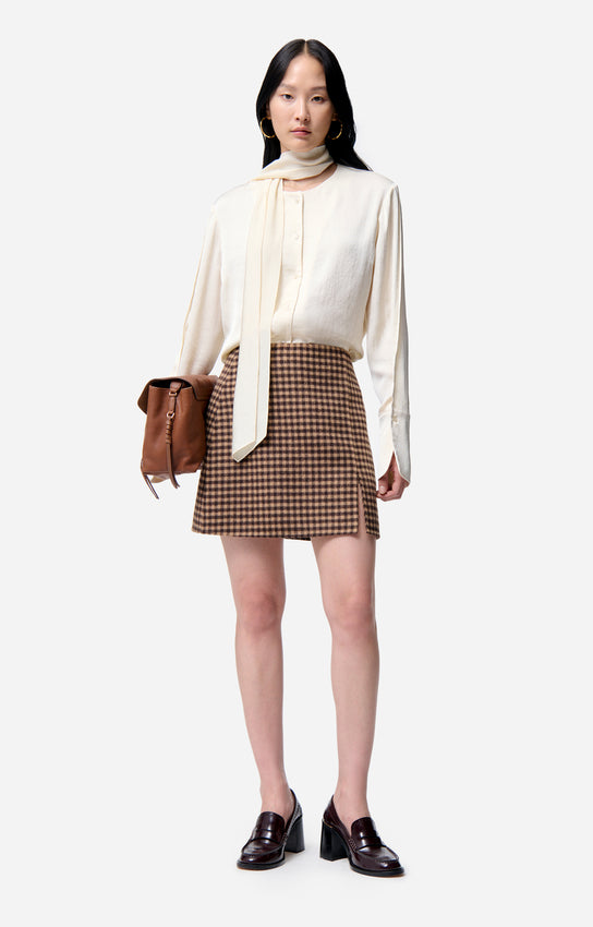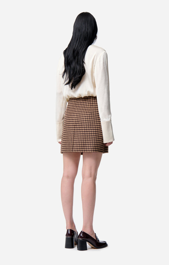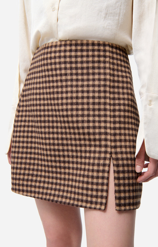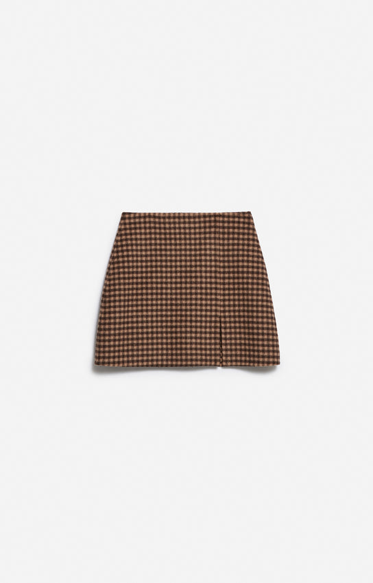Una gonna corta con fantasia check sartoriale, che riprende i codici del guardaroba maschile in chiave moderna. Gonna a tubino scozzese con effetto pied de poule Vita alta Chiusura con zip sul retro