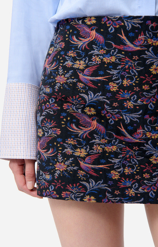 Una minigonna jacquard floreale che trova un equilibrio tra fascino bohémien e stile contemporaneo, ideale con un maglione in maglia fine o una camicia fluida. Forma leggermente a trapezio Jacquard floreale multicolore. Chiusura