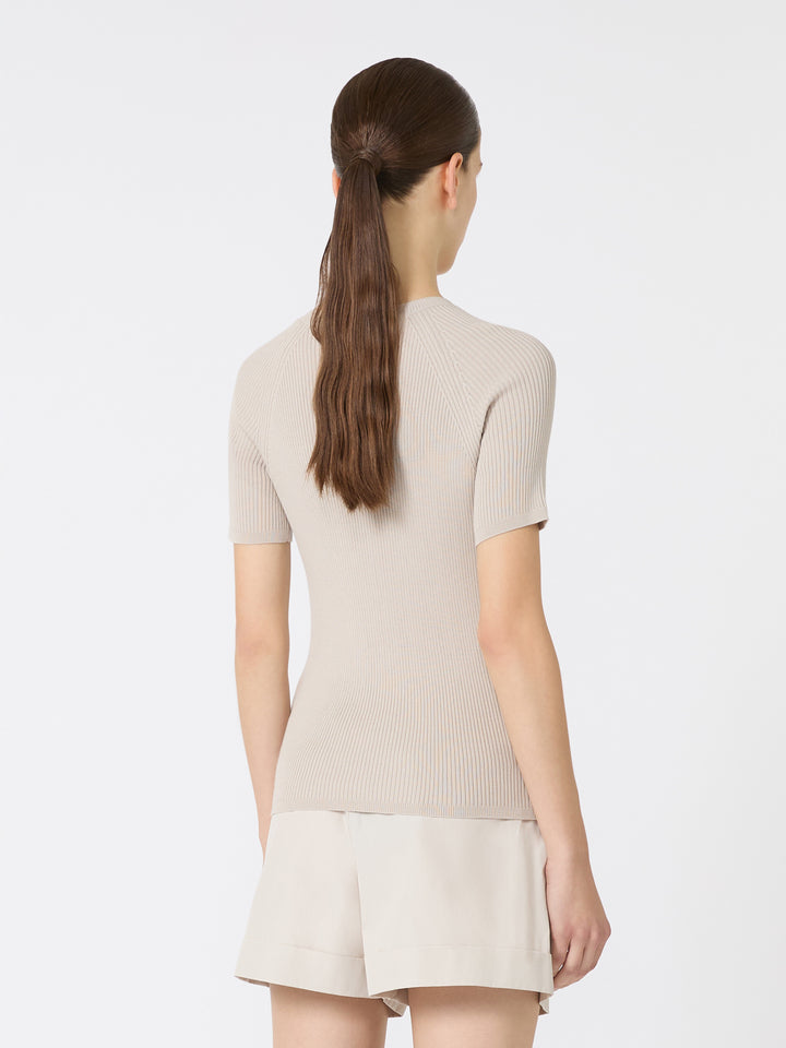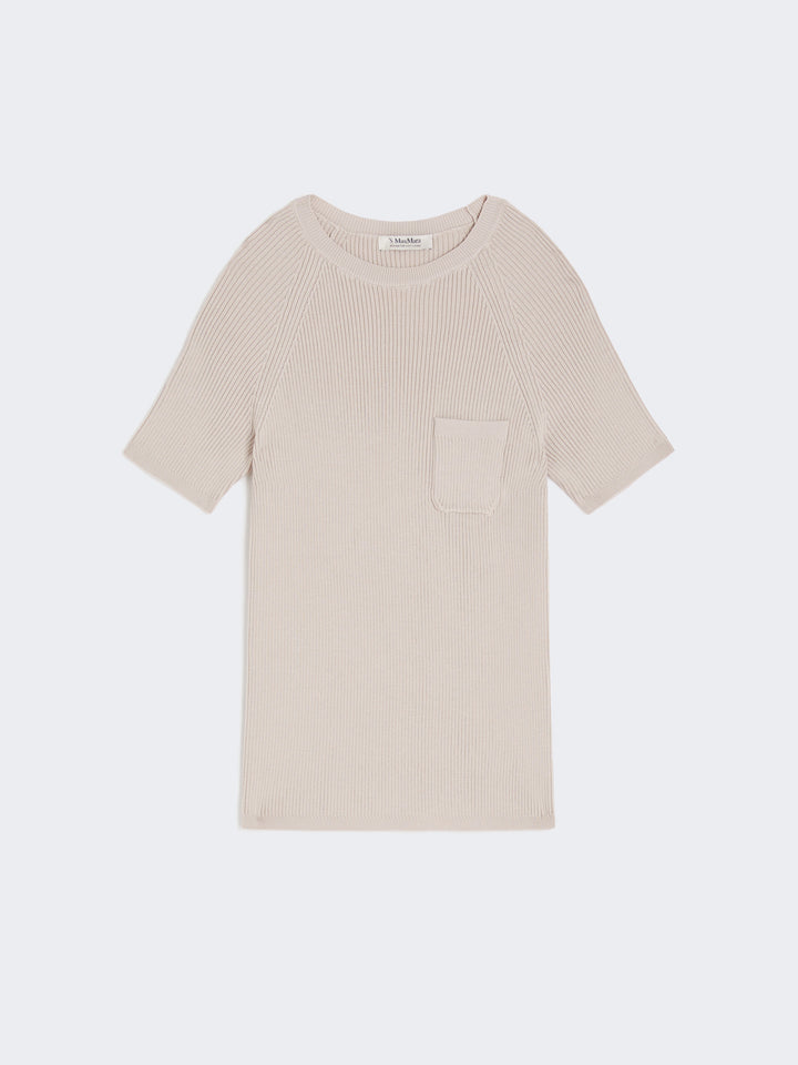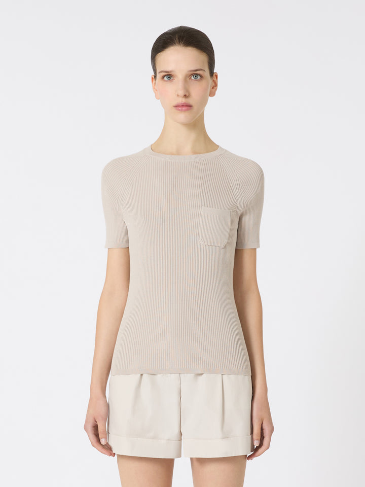 Maglia girocollo con una lavorazione a costine che evidenzia la silhouette. Maglia in filato di puro cotone, Vestibilità slim fit. Maniche corte raglan. Taschino applicato sul petto. Fondo dritto