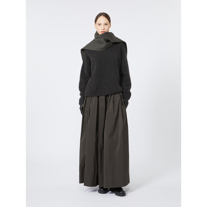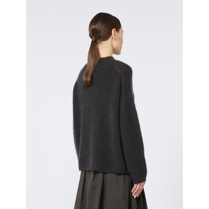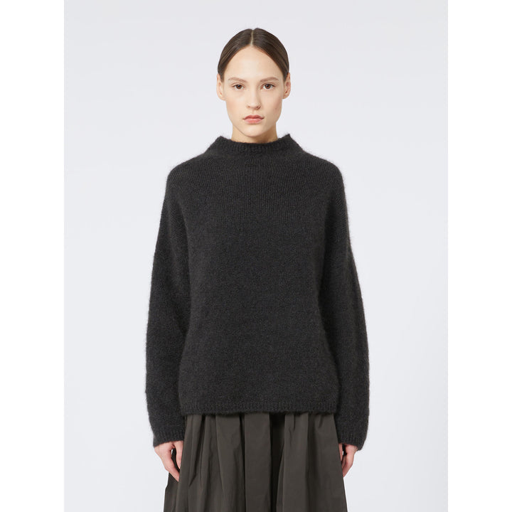 Maglia seamless senza cuciture dalla texture estremamente soffice e leggera. Maglia in filato di misto mohair. Volume rilassato. Collo leggermente montante. Maniche lunghe. Bordi a costine. Fondo dritto