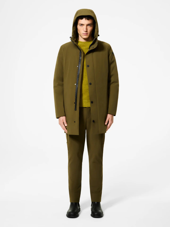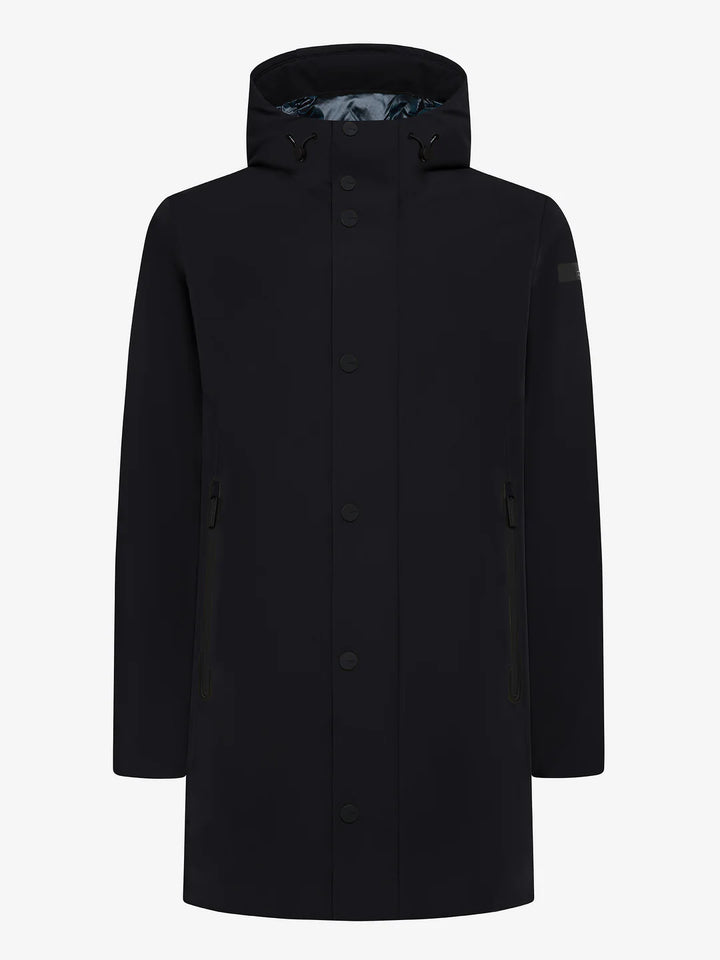 Il design minimalista, l'attenzione ai dettagli e alla scelta dei materiali distinguono l'eskimo in tessuto a membrana Stratofabric#3, traspirante e consistente. La costruzione interamente termonastrata garantisce l'impermeabilità e la protettività del capospalla, dotato di cappuccio fisso regolabile con coulisse elastica. A lasciare fuori il freddo pensa l'imbottitura in piuma d'anatra 90/10, soffice e leggera, racchiusa dai canali tubici a finitura glossy. L'esclusivo sistema Floating Shield consente un fit impeccabile e un comfort impareggiabile alla vestibilità dritta e regolare. Lo stile estremamente nitido è enfatizzato dal look opaco del tessuto esterno Montecristo. Vivacizzano il davanti le ampie tasche laterali termonastrate e i bottoni a pressione gommati neri. Questi ultimi chiudono la patta che nasconde la zip integrale con doppio cursore. L'interno è dotato di un taschino con zip invisibile, impreziosito dal doppio filetto arancione e dall'iconica tag a cuore "Made with love, designed in Tuscany". Il logo a microiniezione nero sulla manica sinistra è il tocco esclusivo che completa la giacca trequarti essenziale e ricercata.
