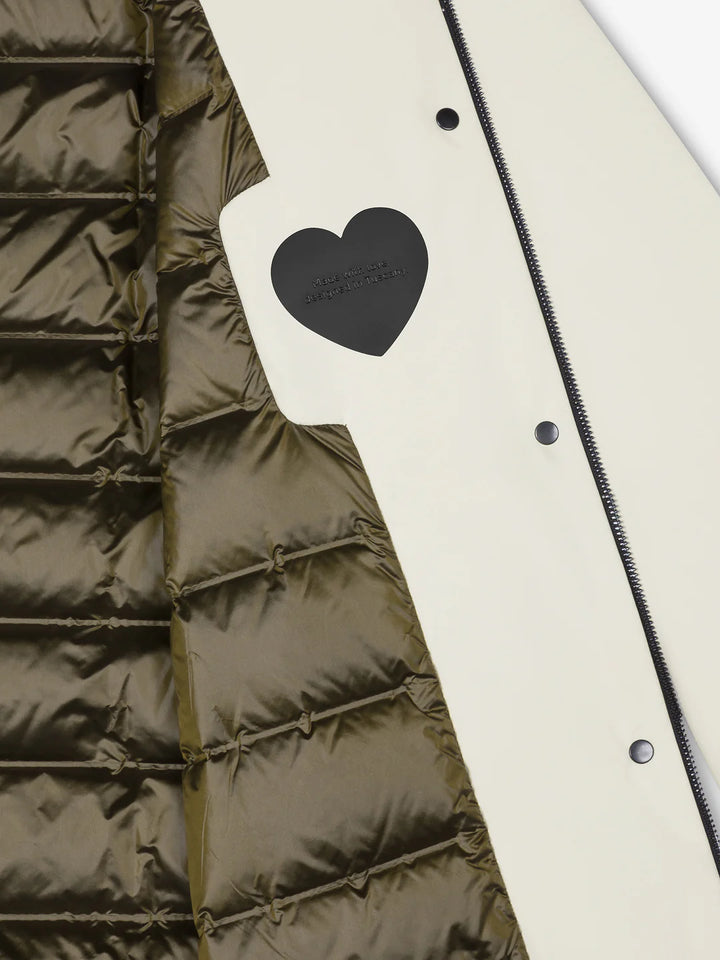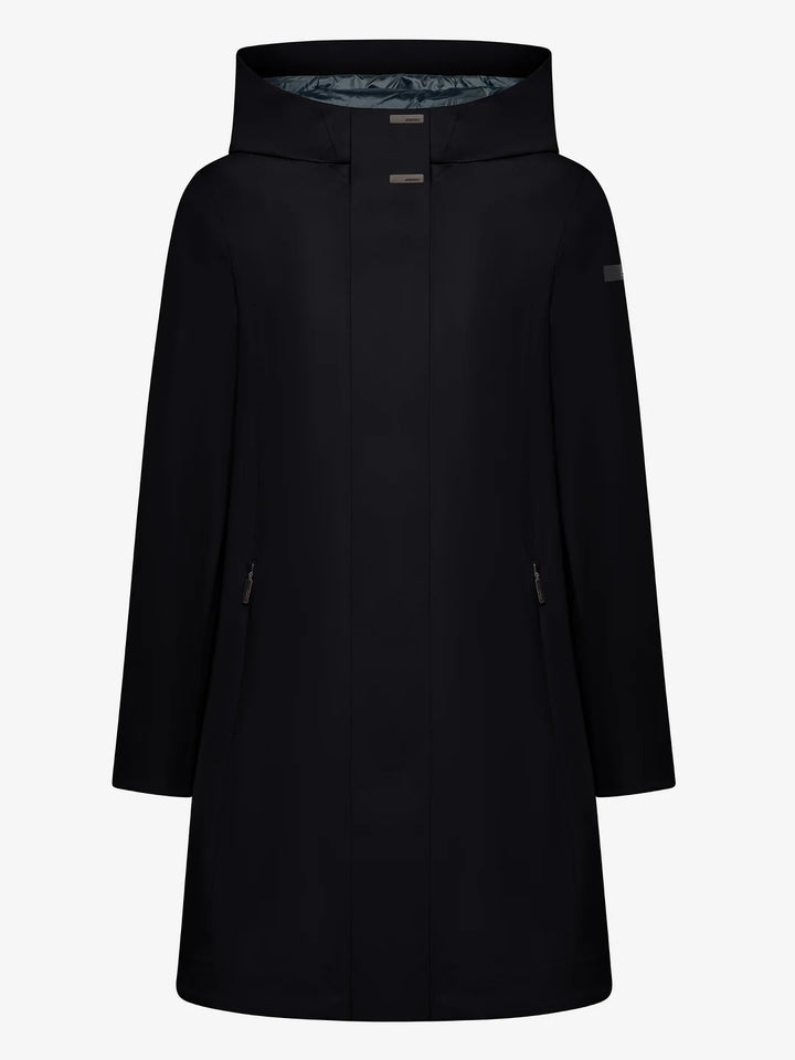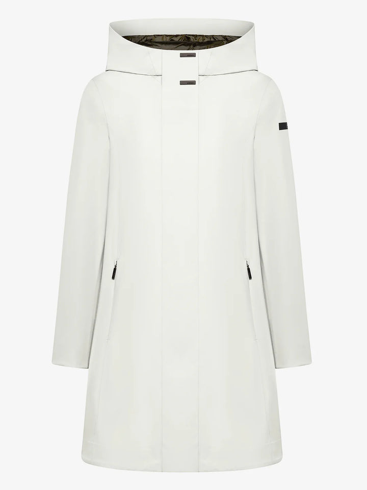 La giacca invernale di lunghezza media si caratterizza per il design funzionale e minimalista, che la rende unica per praticità, isolamento e protezione dal freddo e dalla pioggia. Realizzata in tessuto a membrana impermeabile e traspirante, presenta l'esterno in esclusivo Montecristo dal look opaco e liscio al tatto. L'innovativo sistema floating shield offre un abbraccio di calore dal fit impeccabile, grazie ai canali tubici che contengono l'imbottitura in piuma d'anatra. Il cappuccio, anch'esso imbottito, presenta un design essenziale e raffinato che incornicia delicatamente il viso. Sul davanti, la chiusura a zip è nascosta dalla patta impreziosita dai bottoni a barretta gun metal, che donano un tocco di eleganza contemporanea.