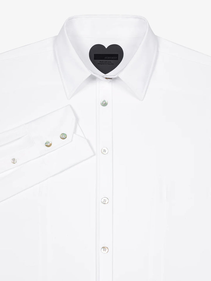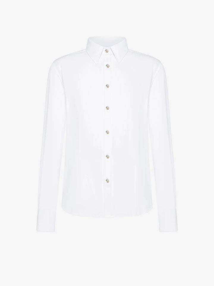 La camicia sartoriale dal taglio maschile è reinterpretata con raffinata modernità nel pregiato tessuto Oxford stretch. La sua mano morbida e leggera accarezza la pelle, offrendo una sensazione di comfort assoluto e naturale eleganza. La silhouette, nitida e contemporanea, è valorizzata dalle pinces frontali che disegnano con garbo la linea del busto. Il colletto essenziale e i polsini di media altezza evocano una sobrietà studiata, mentre i bottoni in madreperla aggiungono un dettaglio di sottile esclusività. La creazione presenta un’eleganza fluida, che trascende le occasioni: ideale per l’outfit professionale di ogni giorno, o nel tempo libero con un denim dalla linea pulita, si trasforma con disinvoltura in un capo dall'allure serale in abbinamento a un blazer in velluto.