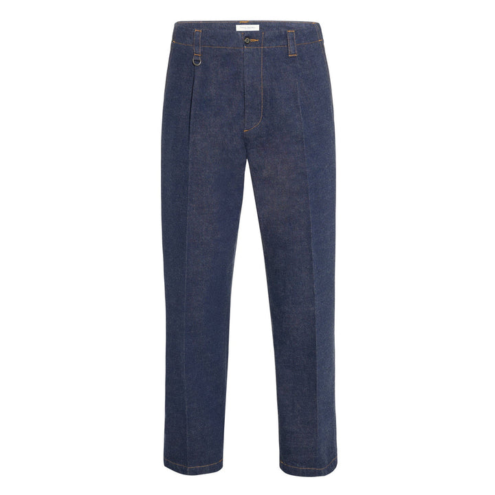Pantalone chino dal taglio relaxed, realizzato in denim indaco di cotone stretch. Il design unisce dettagli workwear come pinces frontali, tasconi applicati e tasca a martello sul retro a una linea sartoriale con piega centrale stirata, passanti per cintura e chiusura con bottone e zip. Un capo resistente e contemporaneo, perfetto per look casual raffinati o outfit urban-chic.