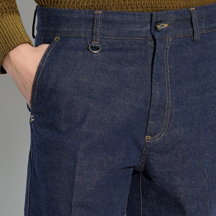 Pantalone 5 tasche in denim indaco stretch con vestibilità loose. Il design essenziale unisce funzionalità e stile contemporaneo, garantendo comfort e versatilità. Un capo casual ma raffinato.