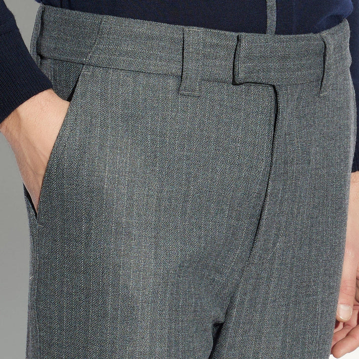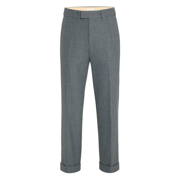 Pantalone chino dal taglio loose in fresco lana gessato con righe tono su tono. Il design sartoriale con fondo risvoltato da 4,5 cm e vita regolare combina sobrietà ed eleganza contemporanea. Un capo versatile e raffinato, perfetto per look da lavoro o tempo libero, realizzato con materiali di qualità e rifinito con cura artigianale.