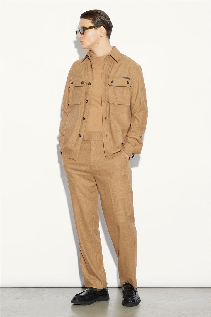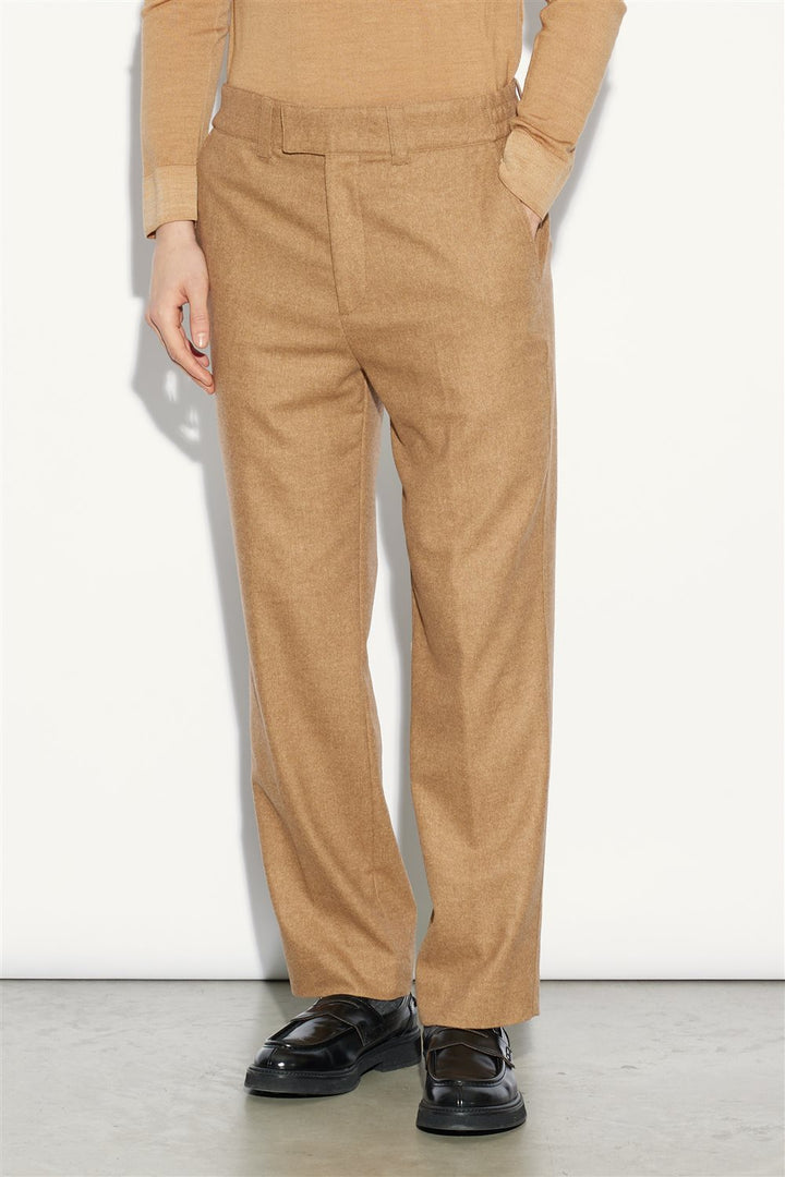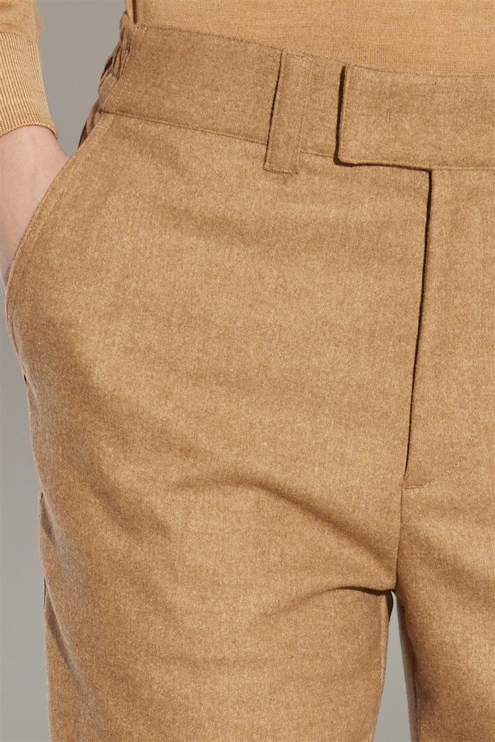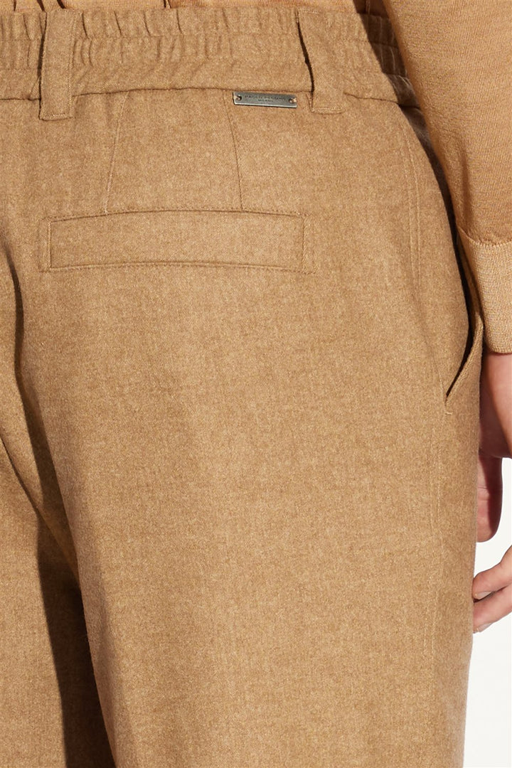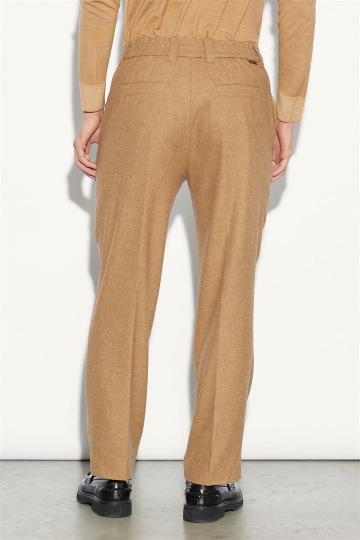 Pantalone chino realizzato in flanella, con vita elasticizzata, pinces e tasche a filetto, caratterizzati da una vestibilità loose.
