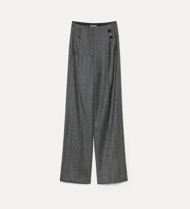 Pantalone vita alta chevron in lana con fantasia chevron e volume asciutto sulla gamba. il passante in eco pelle e la parziale fodera interna sono dettagli preziosi che aggiungono eleganza e comfort. tre pince in vita e linea che accompagna la silhouette.