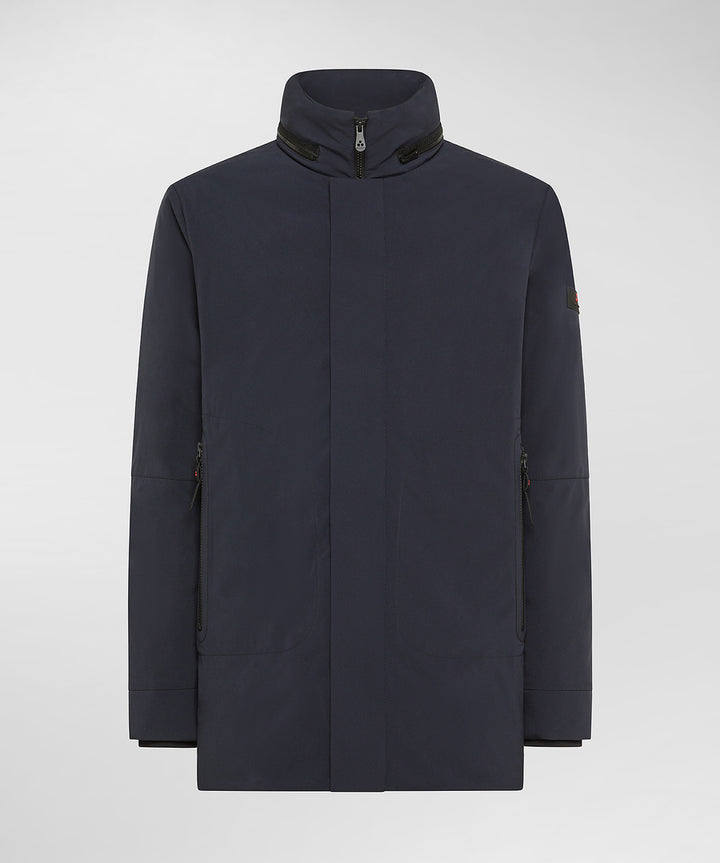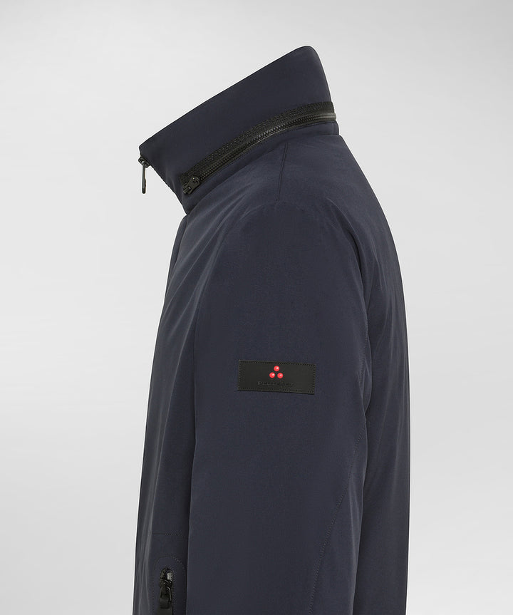 Overcoat in tela di poliestere stretch, accoppiata con un jersey di poliestere soffice e caldo, grazie alla finezza dei filati utilizzati. L’imbottitura in Thermoplume, prima vera alternativa sintetica al piumino d’oca, garantisce calore, leggerezza, morbidezza e comprimibilità e protezione anche in condizioni di umidità. Il cappuccio estraibile, nascosto all’interno del collo, offre un’ulteriore difesa contro pioggia e vento improvvisi. La chiusura centrale con zip nera a doppio cursore, è protetta da una patta minimale, mentre le tasche laterali a filetto e i polsini antivento completano il design. Il trattamento idrorepellente PFC Free protegge dalle intemperie senza l’impiego di sostanze dannose per l’ambiente.