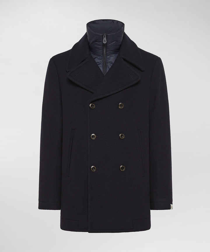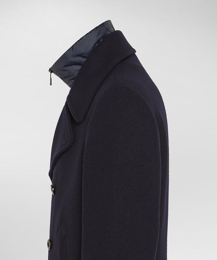 PITLOCH WOOL Giacca doppiopetto con pettorina staccabile in misto lana e acrilico a tinta unita, dalla texture morbida e dall’aspetto essenziale ed elegante. Il collo a rever e i bottoni a vista richiamano il gusto sartoriale, reinterpretato con una sensibilità moderna. All’interno, una pettorina rimovibile con imbottitura sintetica e chiusura a zip, offre un extra layer di calore nei giorni più freddi. Lo spacco centrale sul retro garantisce maggiore comfort nei movimenti