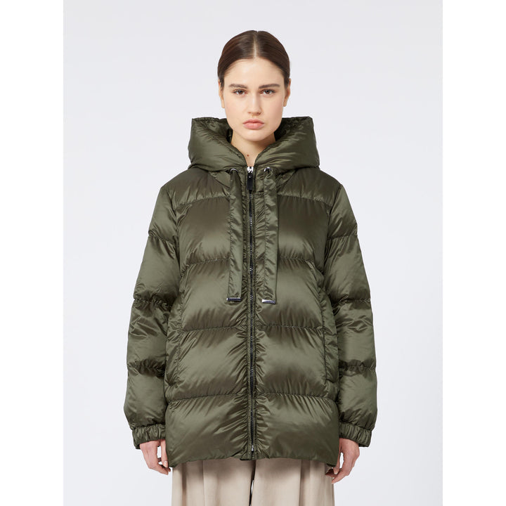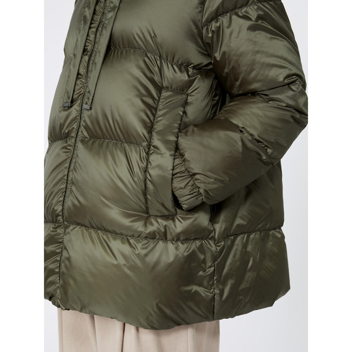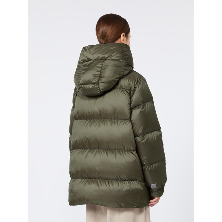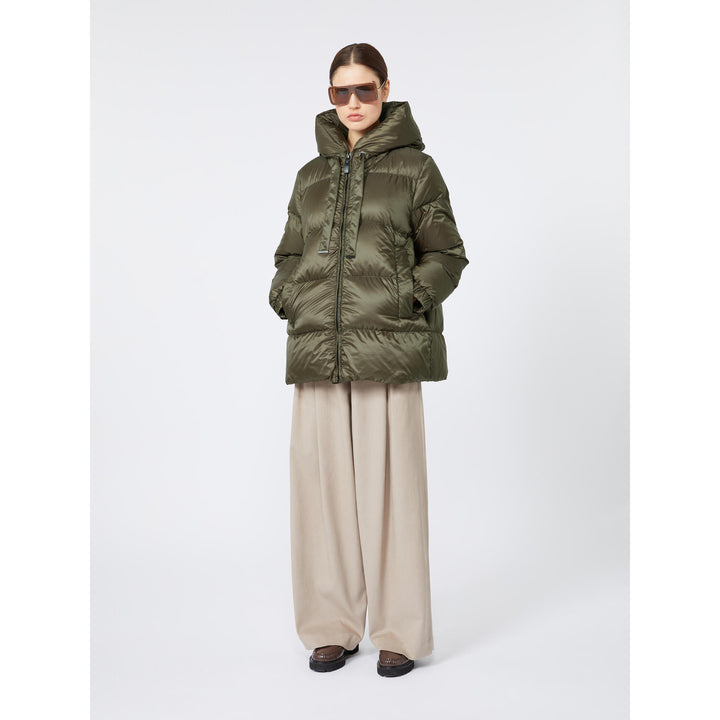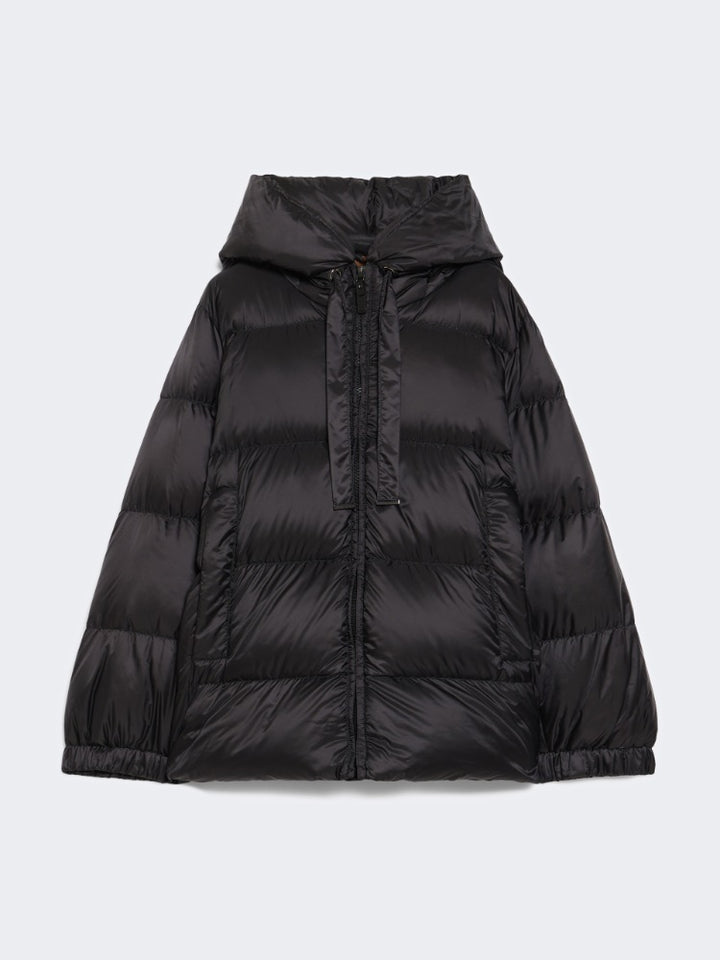 Piumino corto leggermente over, con motivo trapuntato all over a righe orizzontali. Piumino in tela antigoccia. Cappuccio a coulisse. Maniche lunghe con polsino elastico. Chiusura frontale con zip e cursore in pelle. Tasche a filettone sui fianchi Imbottitura in piuma d'oca