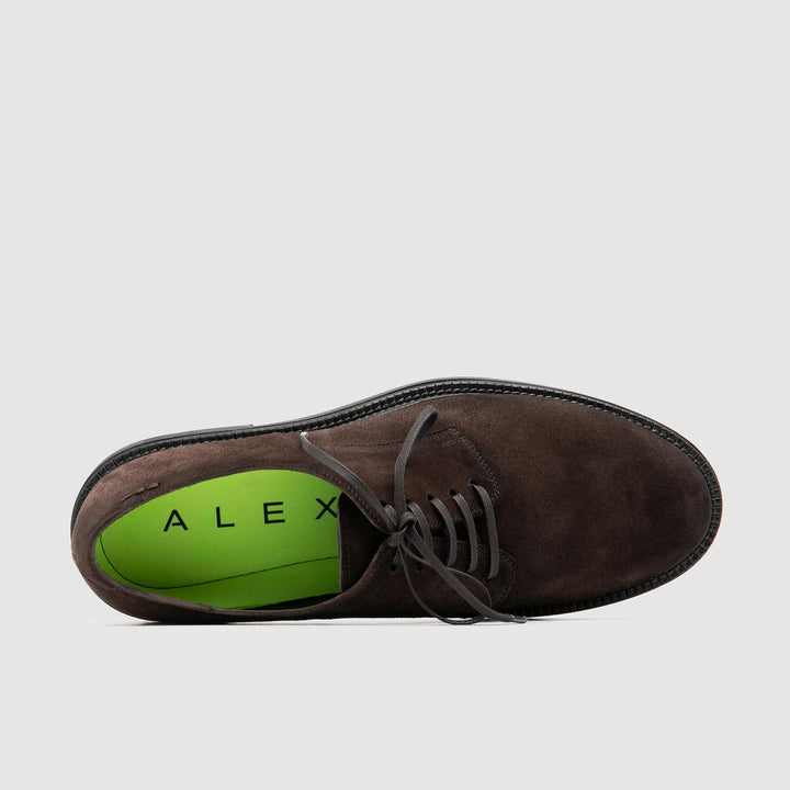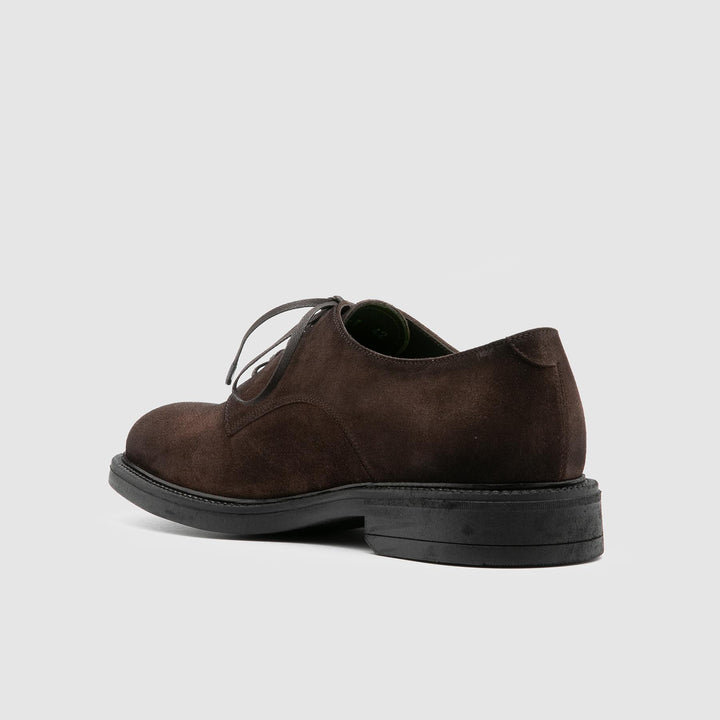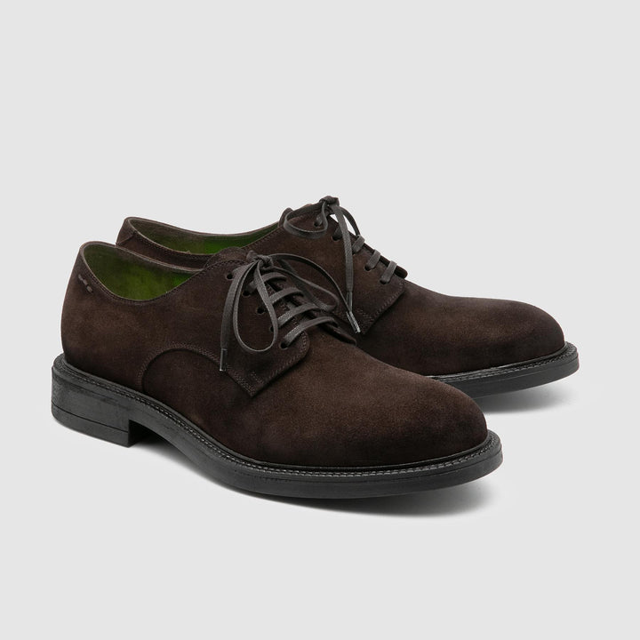 Raffinate scarpe Derby da uomo realizzate in morbido camoscio marrone scuro, perfette per ogni occasione formale o business casual. La struttura e la suola in gomma assicurano stabilità durata e comfort, caratteristica enfatizzata dal fussbett tecnico estraibile. Il design essenziale valorizza ogni outfit con un tocco di classe senza tempo. Ideali per l’autunno e l’inverno, offrono comfort e stile ineguagliabili.