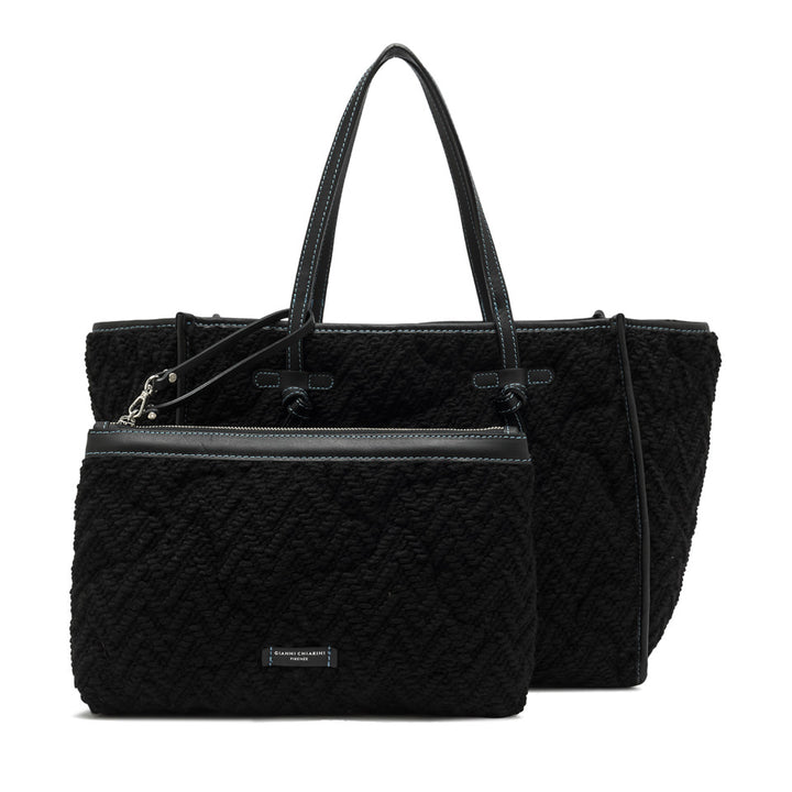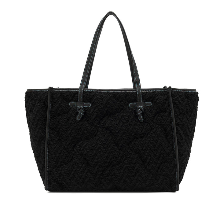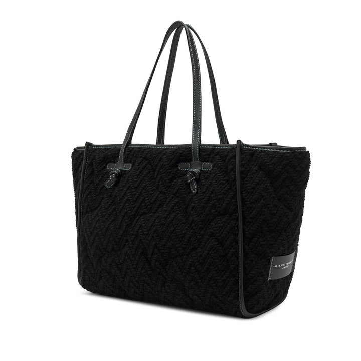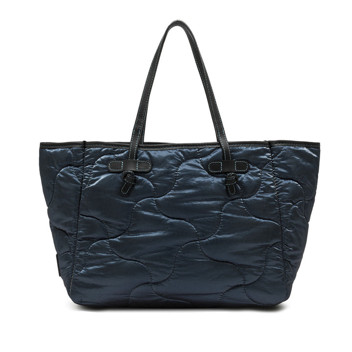 La shopping Marcella è realizzata in tessuto double-face trapuntato, composto da un tessuto spigato di lana da un lato e nylon dall'altro. Dotata di manici in pelle e di una comoda chiusura tramite magnete, è ideale per connotare di stile i look invernali. Dimensioni: 38x31x16 cm.