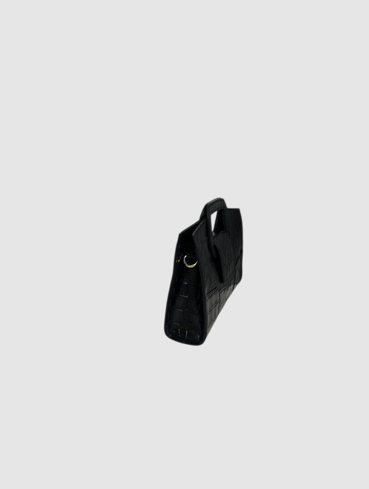Pochette rigida, doppio manico, chiusura con zip e bottone, unico vano centrale, tasca portaoggetti, tracolla rimovibile e regolabile max cm 124.