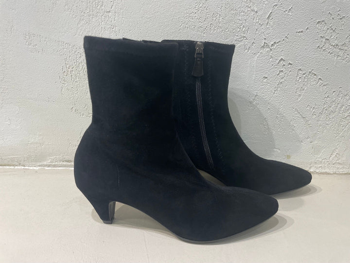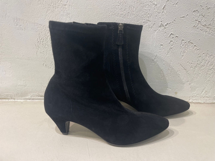 Un'eleganza raffinata e intramontabile definisce la silhouette di questi stivaletti. Realizzati in camoscio stretch nero, un design a punta ideali per aggiungere carattere ai tuoi outfit.