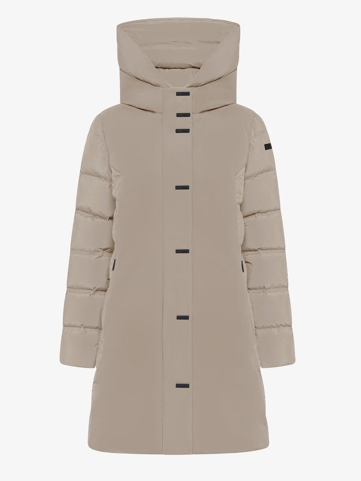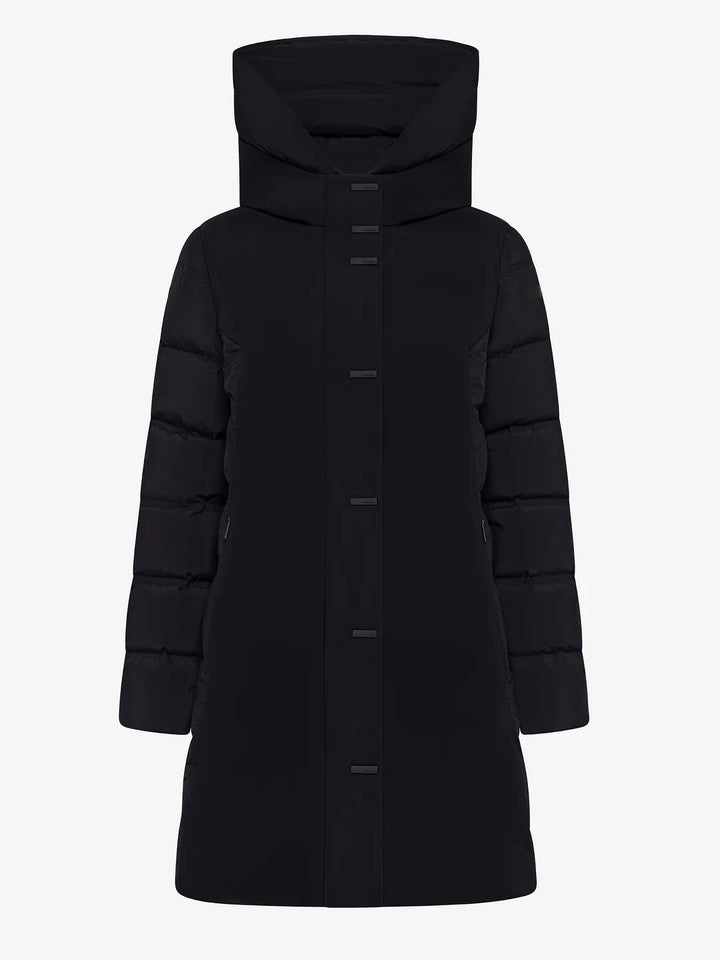 Il capospalla dal fit regolare con lunghezza al ginocchio si distingue per lo stile pragmatico e al contempo elegante. Il tessuto a membrana traspirante e impermeabile sa unire alla leggerezza dei materiali hi-tech l'assoluta protezione dalle intemperie e dal freddo più pungente. Il davanti si caratterizza per il look super opaco dell'esterno in SURFLEX®, particolarmente liscio al tatto, che gioca a contrasto con la texture del retro, le maniche, i fianchi e il cappuccio imbottiti dai canali tubici privi di impunture, che contengono la calda imbottitura in piuma d'anatra. Il sofisticato dettaglio della pattina con bottoni a barretta satinata nasconde la chiusura a zip termonastrata con il pratico doppio cursore. Le tasche laterali con zip invisibili e il logo a microiniezione nero sulla manica sinistra completano lo stile distintivo del capo. Il parka, dall'anima versatile, può essere indossato con pantaloni dal taglio carrot per donare uno stile unico e distintivo all'outfit invernale di tutti i giorni.