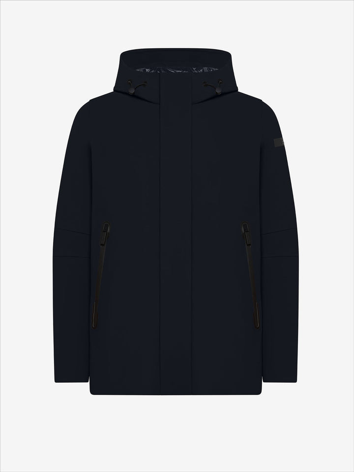 La forte contemporaneità dello street style si fonde perfettamente alla performance e alla versatilità di Surflex Winter Mdm Jkt. Il capospalla invernale si distingue per la costruzione del tessuto a membrana Stratofabric#3, impermeabile e traspirante, rinforzato dalle termonastrature interne. Il look monocromo e super opaco dell'esterno nell'esclusivo tessuto stretch SURFLEX® spicca sulla finitura glossy dei canali tubici, totalmente privi di impunture, che contengono la calda e leggera imbottitura in piuma d'anatra 90/10. La pulizia e il minimalismo del design sono enfatizzati dalla patta a bottoni metallici, invisibili dall'esterno. Questa nasconde la zip integrale a doppio cursore che chiude il davanti, fino al colletto verticale e al cappuccio avvolgente regolato con coulisse elastica. Il modello presenta due ampie e pratiche tasche laterali caratterizzate dalle zip termonastrate, più altrettante interne a zip invisibili, ravvivate dal doppio filetto arancione fluo e dalla tag a cuore "Made with love, designed in Tuscany". Il logo a microiniezione nero sulla manica sinistra completa un capo nitido e dinamico.