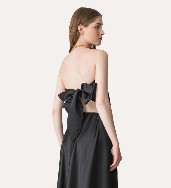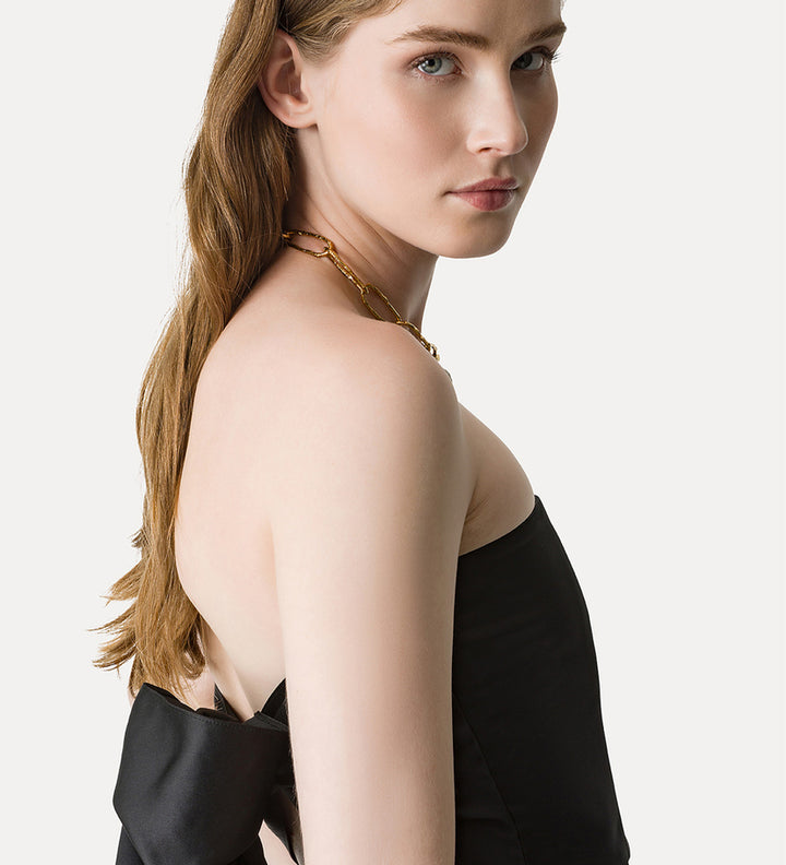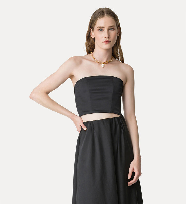 Top bustier in duchesse con fusciacca da annodare sul corpo. l'ispirazione è la couture, essenziale delle linee ed elegante nella ricchezza del tessuto. lo scollo dritto è sorretto da stecche interne, reso ancora più raffinato dalla lucentezza del tessuto. da indossare anche fronte retro